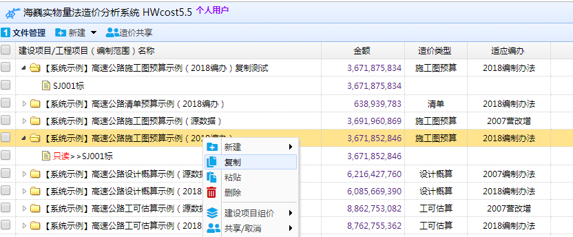 在海巍造价软件HWcost5.5中,一直以来都只将示例工程共享给杨志朴老师推荐的试用用户和正式用户只读查阅。近期以来,许多用户在使用过程中,希望能够对示例工程进行调整修改并体验修改效果。经过众多用户的申请和要求,我们现将所有示例工程全部权限放开。用户进入系统后,先通过鼠标右键勾选“显示示例工程”将示例工程显示后,可以直接复制示例工程建设项目和工程项目作为自己的项目,并对项目进行修改和调整。